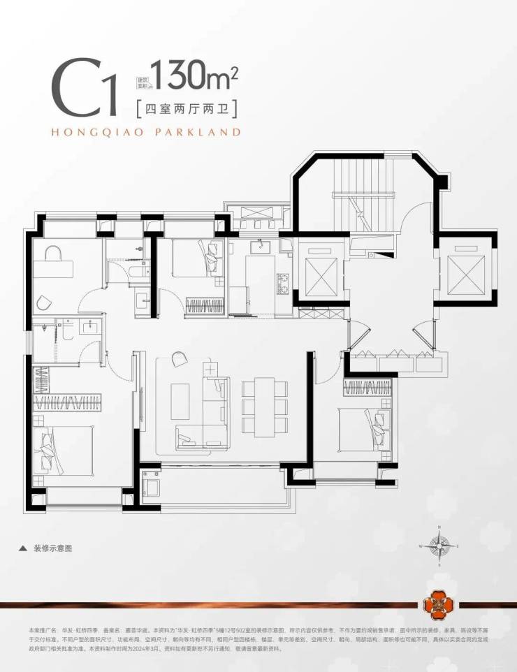 而 130㎡的四房,南北通透,客餐厨一体化设计,搭配 U 型厨房与三分离卫浴,为三代同堂打造高品质居住体验。