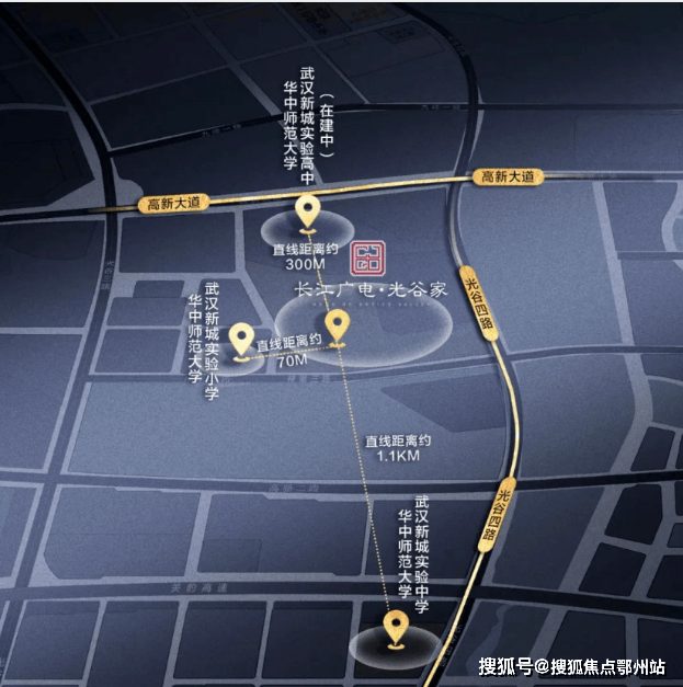 项目正处高新大道与光谷四路交汇处,周边约1.5公里之内汇集了光谷东现有的顶级资源,可以说是光谷东内环核心的核心,聚集的是光谷东天花板级配套。