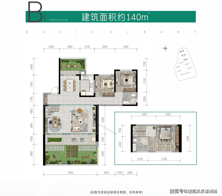 建面约140㎡: 一楼南北双向绿化阳台,南向庭院巨大,大横厅设计,也可实现3间次卧格局。