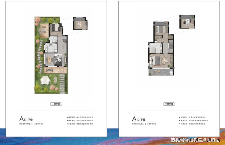 来看户型,面积段有两种—— 建面约95㎡下叠、上叠;建面约150㎡下叠、上叠。