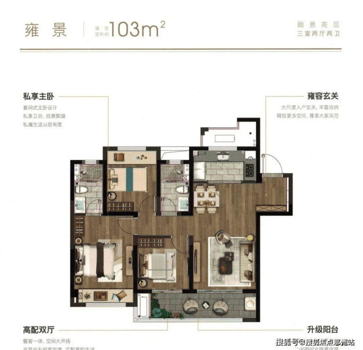 成为全家生活的欢乐场; 双主卧套房带来尊崇私域化空间体验, 独立卫浴,营造更温馨的起居氛围, 南向宽景飘窗,给居者足够明亮的从容空间……