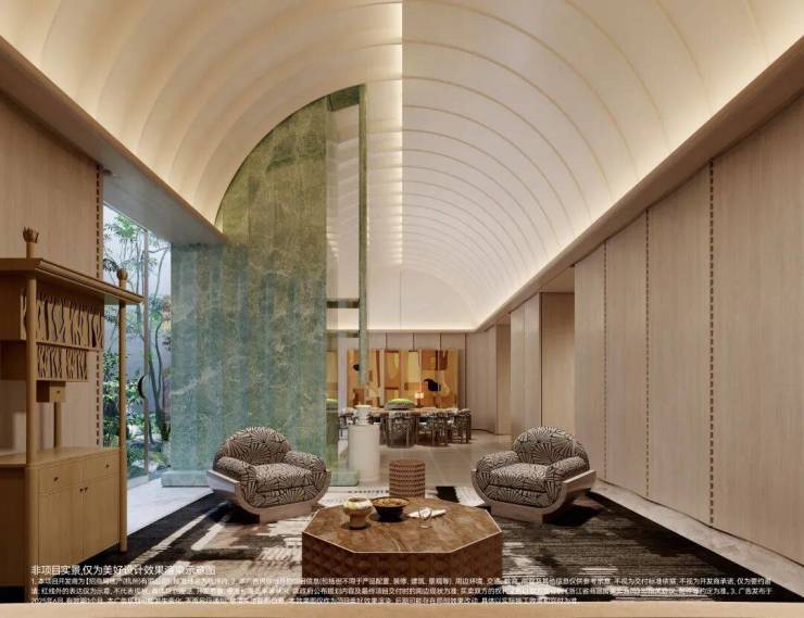 内外双重门厅 景墙 运用了约1000方顶奢才会用上的 月光米黄石材 ,还是更费料的弧形石材,搭配香槟金线条,与爱马仕全球旗舰店的双曲面叠墙造景手法如出一辙。