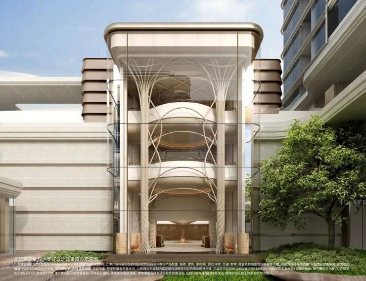 项目的会所「 生机之亭 」,是特邀国内顶奢上海翠湖天地的设计团队「 集艾设计 」执笔打造,采用折衷轻法风格,整体高约14米,镶嵌四根高耸入云的“ 生机之树 ”,撑起巨大的三层观景门廊,用约8吨不锈钢精雕细琢,犹如展开的飞翼,传达生机勃勃的意象。