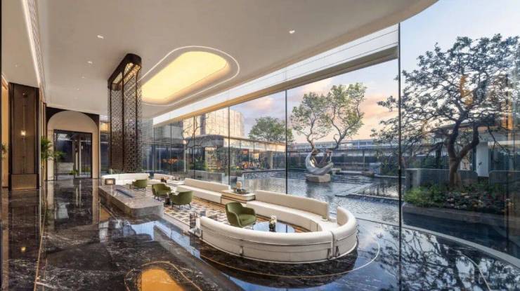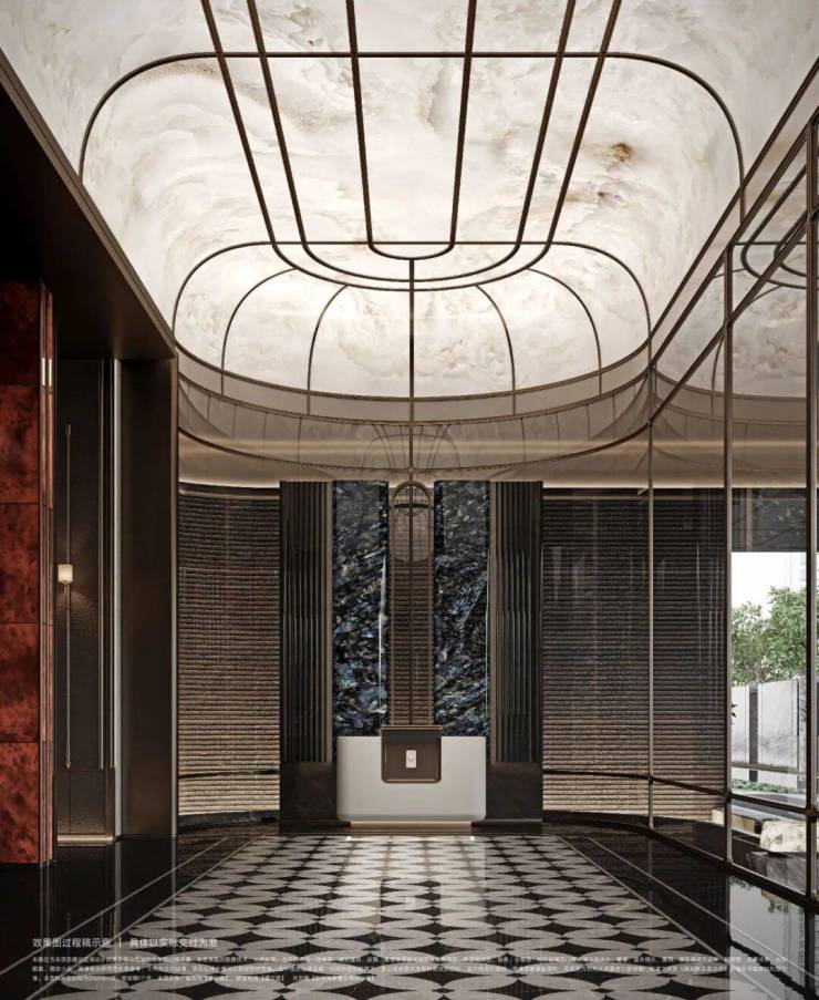 穿过华贵门廊,一境登门庭入府,超阔的接待前场是贝母形大理石地面铺贴纹路,头顶是 透光云石弧形穹顶 , 正前方是皇室杈木影壁,接待台背部静置着“蓝翡翠”奢石背景屏风,以及与下沉水院一体的“ 三生石 ”造景,处处流露着优雅的艺术场域。