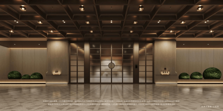另外,项目首层通过硬朗直线呼应柔和曲线勾勒,辅以温润石材与古铜色金属线条融合,打造东西方美学共融的艺术藏品