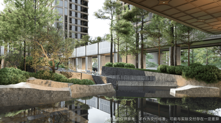 它告别了传统社区在局促空间里“造景”的束缚,转而以“规划一片生态”的思维,将约6000㎡的滨水绿带、近3000㎡的下沉庭院,以及建筑之间广阔的间隙,全部转化为景观的舞台。