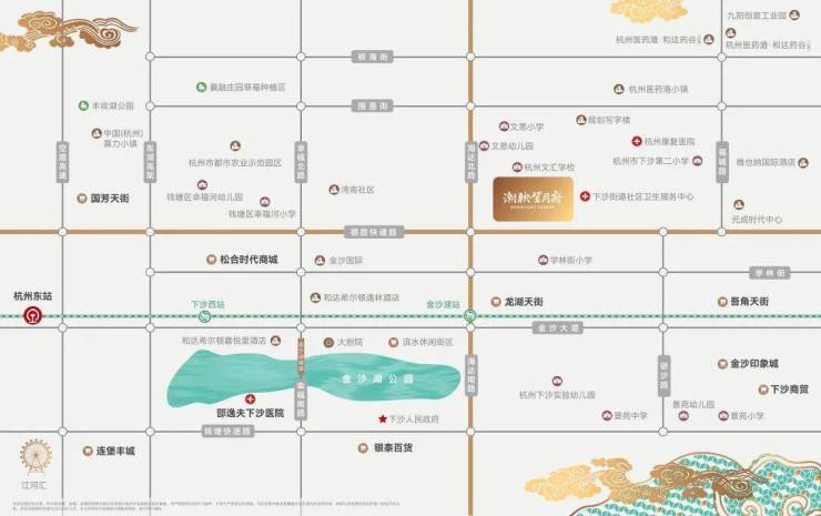 圣奥·潮映望月府所在下沙元成板块,即是:金沙湖北。提到金沙湖,大家都不陌生,这片以金沙、棕榈树为符号的杭州新一代国际湖区已然趋近整体建设的尾声。周边金沙湖大剧院、希尔顿、金沙天街等一系列配套已全部建成投入使用,一副兼具国际度假质感,又具有当代生活高阶烟火的景象已然在湖区铺陈展开。