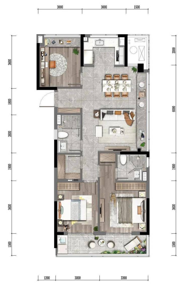 106㎡三房两卫,均为边套。边套最大的感觉就是公区非常阔绰,约6米的边厅自带飘窗,尺度感非常强。