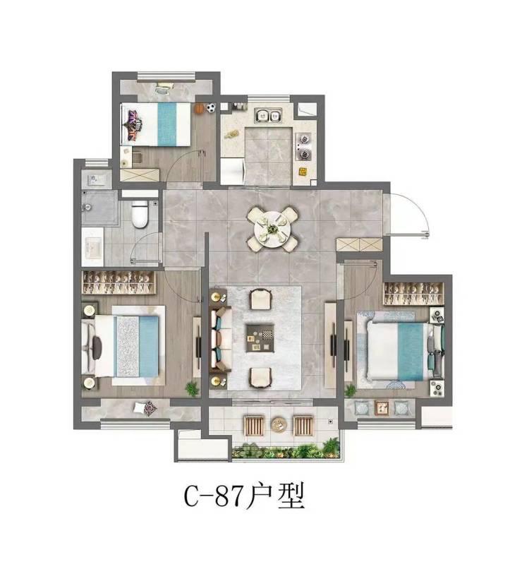 建筑面积约87㎡三房户型,可谓云湖壹号的“头牌明星”。三开间朝南,南北通透,所有卧室均带飘窗,不管是采光、通风、还是视野,这个户型都无懈可击。
