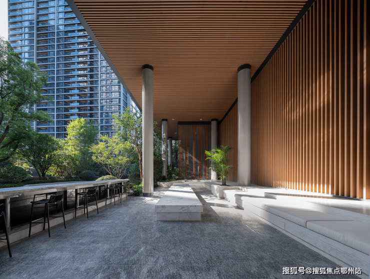 全小区覆盖、约9米高的风雨连廊不仅是业主遮风挡雨的功能区,同时也承担了项目景观空间转换的过渡。