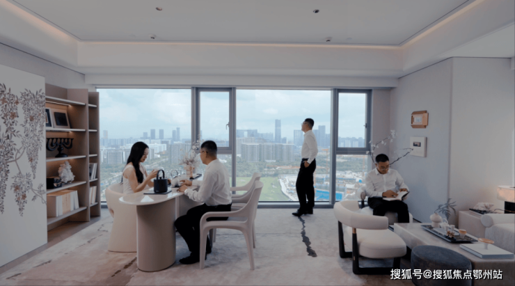 进入室内, 270度的全景玻璃无界观景,超100方的会客厅 ,视域广阔,将窗外的湿地湖泊与第三中心的城市天际线尽收眼底。