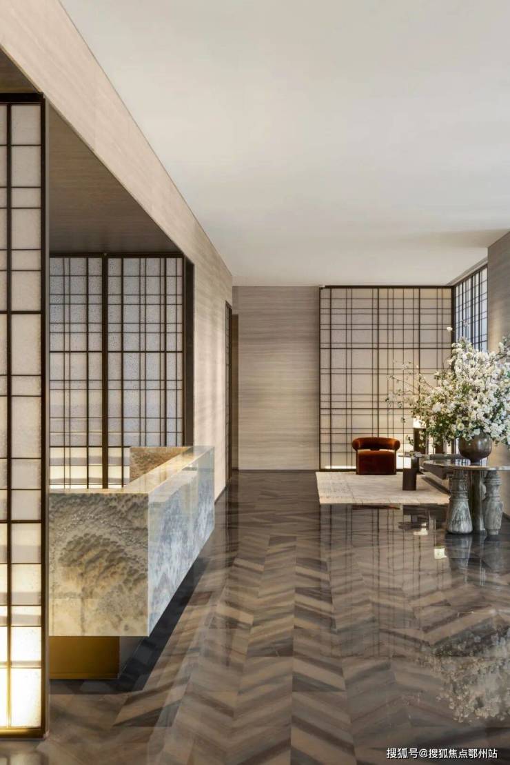 地库连接着会所,入口的玄关充满仪式感,水景结合天光、月光灰的石材背景和地面的马蹄石营造出一种古朴自然的氛围。它的归家动线也十分考究,传统的地库大堂进来后直接到达电梯厅,而瑞玺则是做了一段具有艺术氛围的过渡空间让归家的心绪先沉淀下来,实现外部喧嚣到居家宁静的完美切换。