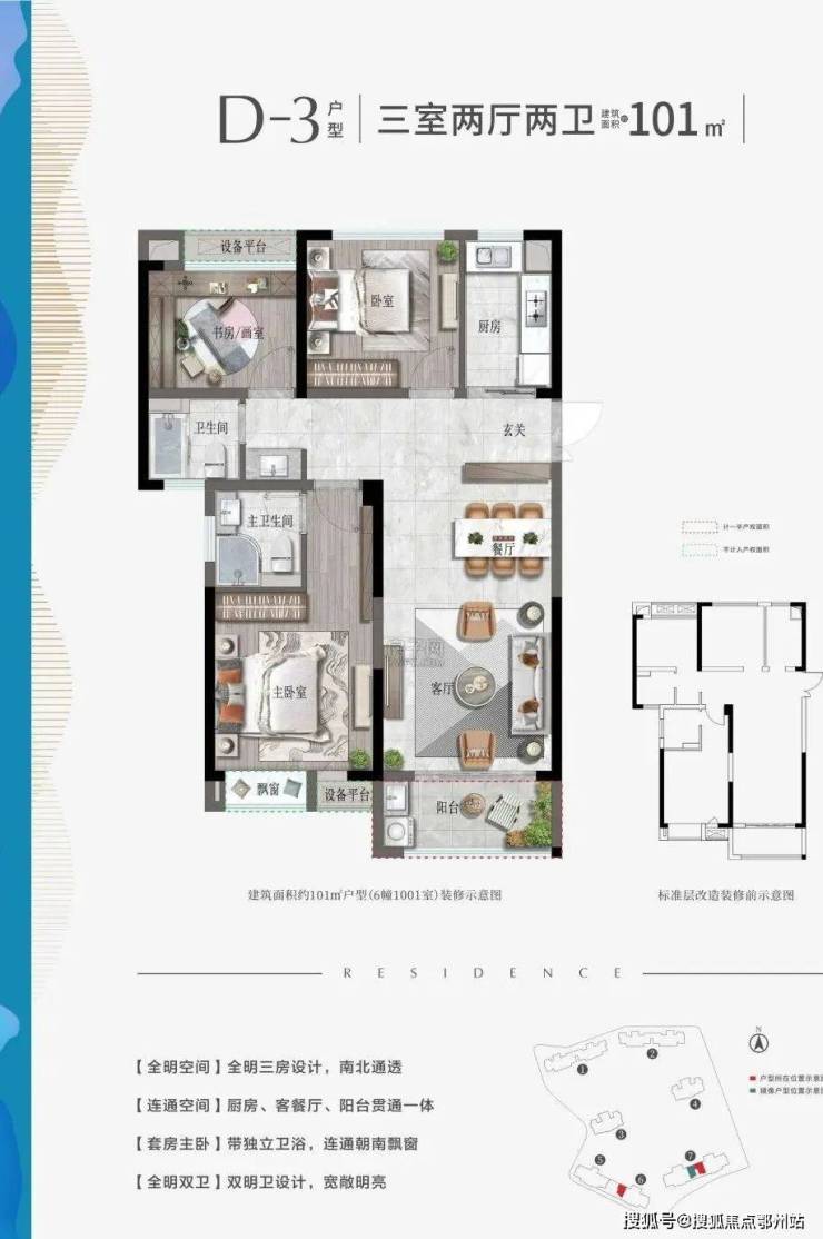101平,三室两厅两卫,中间套
