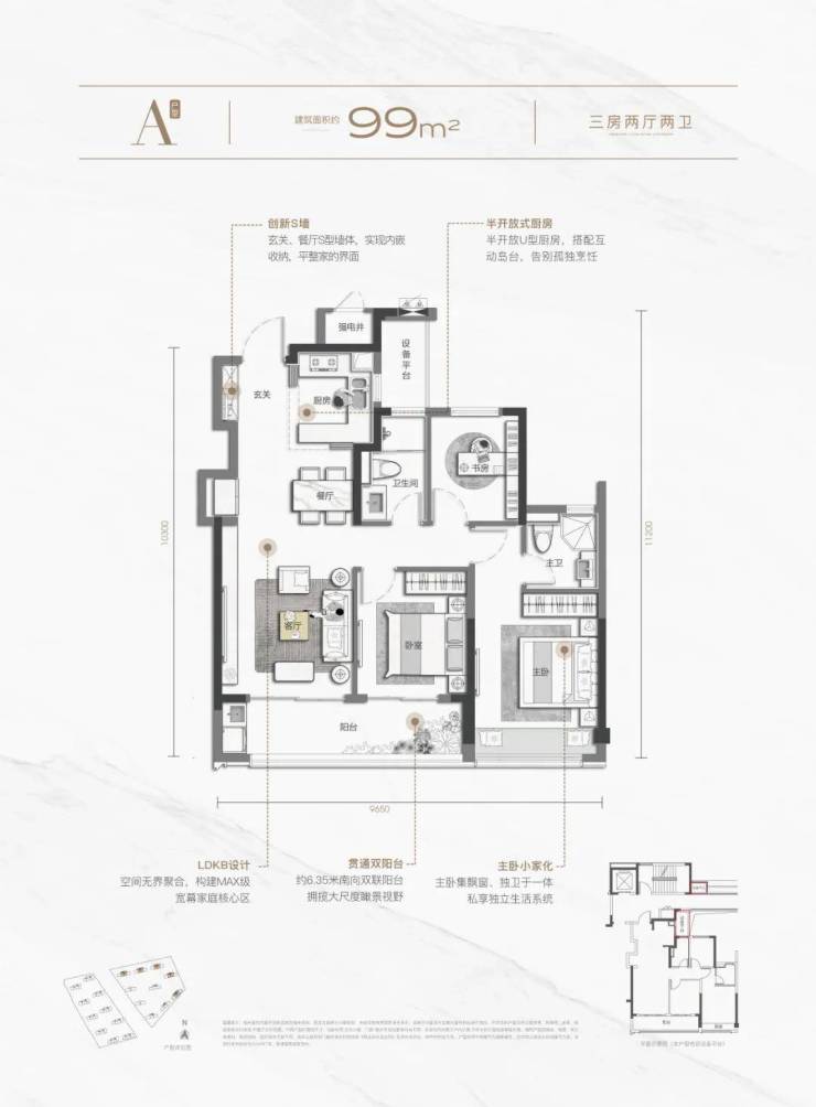 建面约129平方米四房两卫和99平方米三房两卫的户型 ,也都各有亮点。前者具有宽屏大横厅和约9.1米跑道阳台,后者也具有约6.35米的起步双联阳台,视野开阔。