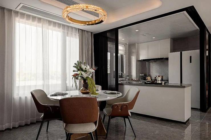 不仅如此,整体空间采用LDKB一体化设计,半开放式厨房搭配L型玻璃移门,可以自由切换,让空间具有魔法。