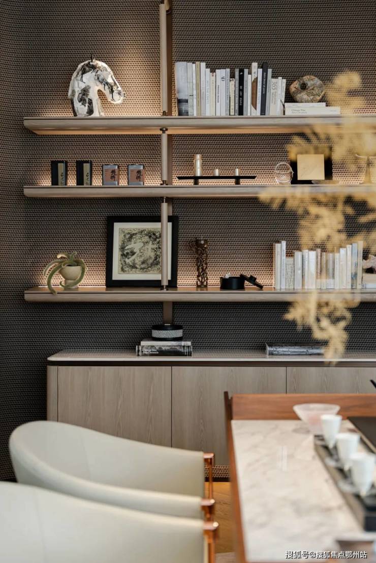 在茶室,设计师选用木美MaxMarko品牌,中式圈椅造型美学辅以天然皮革材质,温润的大理石结合古韵实木,古朴典雅又符合现代美学,在不同材质的碰撞中,探讨当代茶与生活方式的融合。一抹绿意伸展,袅袅烟影落于晴窗,私藏一隅东方雅韵,阅尽书籍的历史厚重感,在茶香与墨香中沉淀生命诗意。