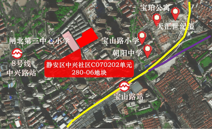 地块北侧象山小区、西侧是静安区闸北第三中心小学。