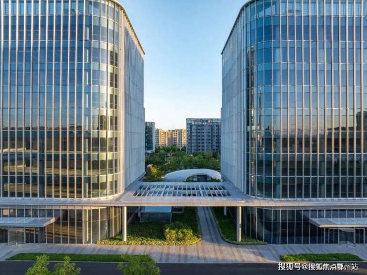 园区中央景观以“活力轴”与“绿河轴”双轴结构展开。活力轴从御桥路延伸至滨水广场,串联下沉广场、景观建筑及公共开放空间,形成充满仪式感与互动感的动线。绿河轴则由西侧大寨河桥延伸,穿越中央绿地至园区南门,构建完整步行网络。