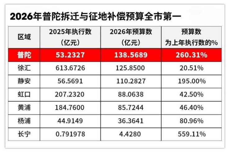其次,2026年普陀拆迁与征地补偿预算高达约138亿,全市最高。 真金白银投入之下,普陀城市界面、市政配套将迎来新一轮大幅升级,区域发展全面提速。