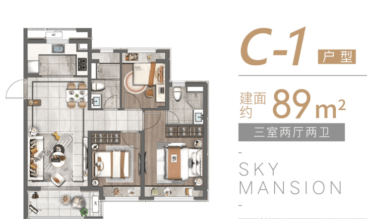 9-10层洋房: 建面约89㎡(三房两厅两卫)