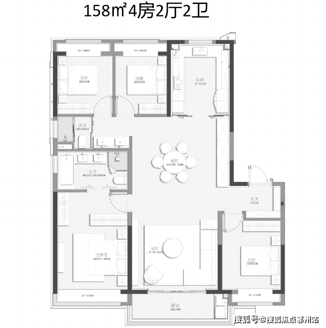 户型方正,多面采光,可以看做是在建面约99㎡户型上的升级,适合改善类购房人群, 主卧套房自带双台盆+浴缸,生活品质拉满。