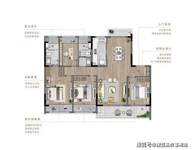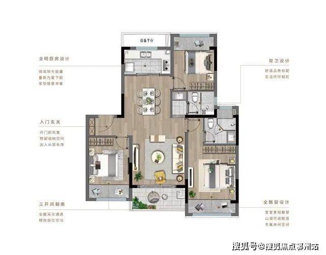 设计亮点:超高得房率(83%-86%),卧室无外机位设计,全屋飘窗提升采光;底复产品为苏州稀缺墅级体验