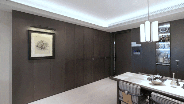 如果说吊顶是建筑的皮肤,那么墙壁便是灵魂的铠甲。卧室区域外,除了s空间,墙壁均为木饰面+岩板,并且 使用了天然昂贵的影木,橡木。