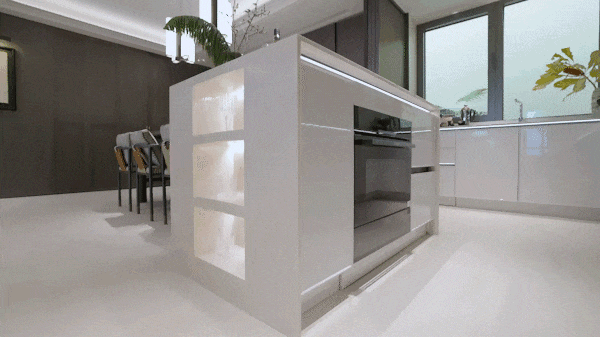 建面约140㎡以岛台交付 ,蒸烤一体机、暖碟抽屉 随时待命,壁龛储物空间暗藏感应灯带,更是为厨房增添了一份实用与美观。