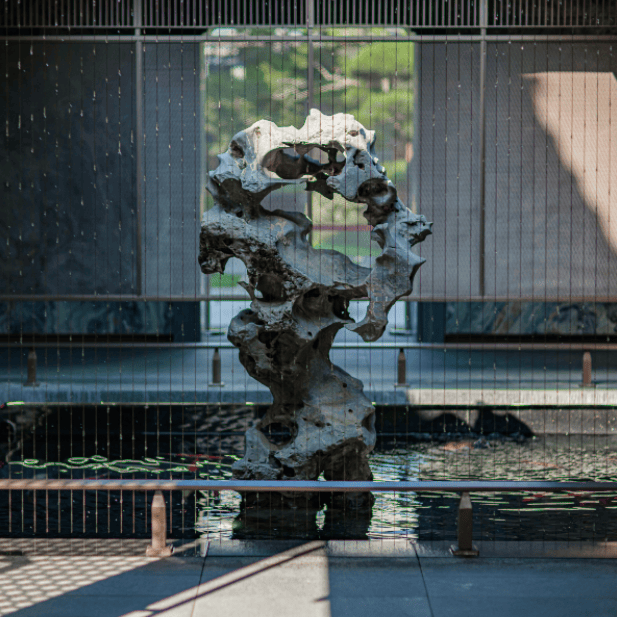 近40吨汉白玉、近100吨原生太湖石、巴金西口“璀璨年华”奢石、300岁高龄的进口珊瑚枫、20年红梅,数十年贵妃罗汉松、羽毛枫和黑松,近百年的原生紫薇……随处可见。