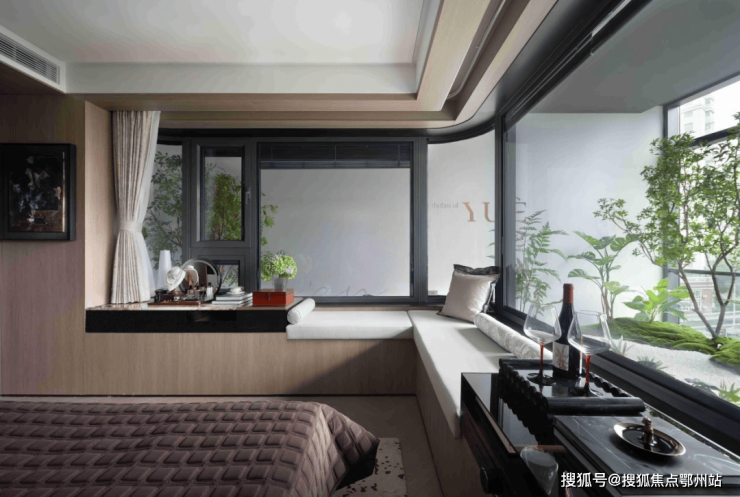 270°超大转角飘窗 :是主人仰望浩瀚星空的所在,俯瞰满目绿意。三玻两腔Low-e玻璃系统窗,保证了主卧的极度静谧,兼顾功能与情感维度,创造全新的生活方式。