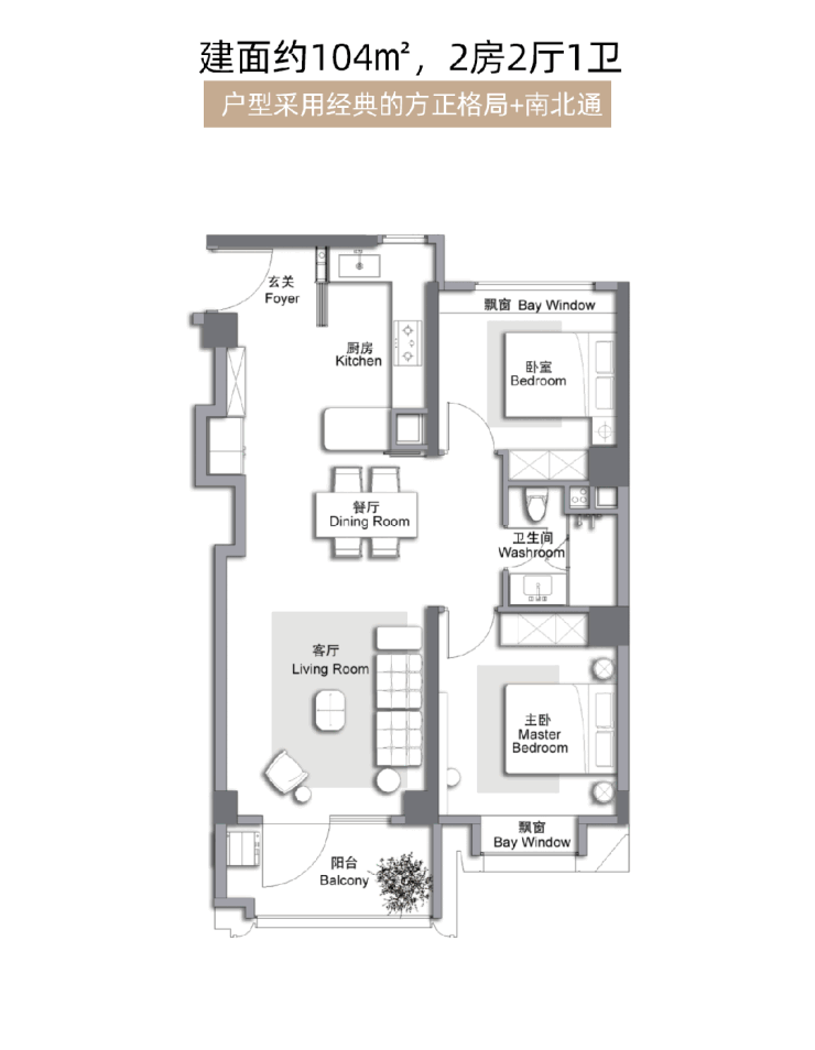 先来看建面104㎡大两房户型。