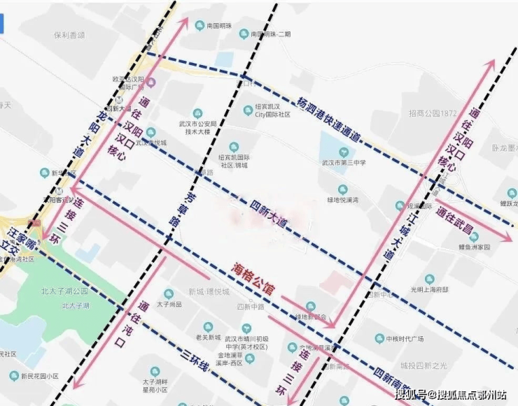 项目周边有四新大道、江城大道、龙阳大道及杨泗港快速通道等多条主干道,且距离都不远,到杨泗港快速通道约1.2公里,上下都是一脚油门的距离。项目南边四新南路可以连接江城大道和龙阳大道、都能快速的上三环,杨泗港快速通道可以快速通往大武昌,自驾出行非常便利。
