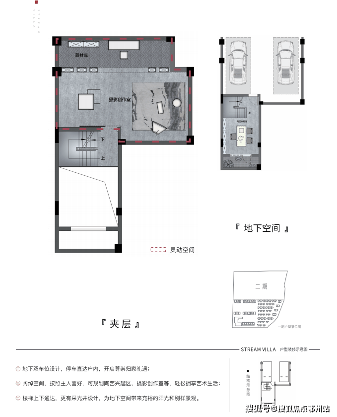 地下室层高阔绰 ,可进行 隔层设计,1层当2层用 ,配备可直接入户的 双车位 ,以及 通透的采光 设计,升级合院尊贵体验。
