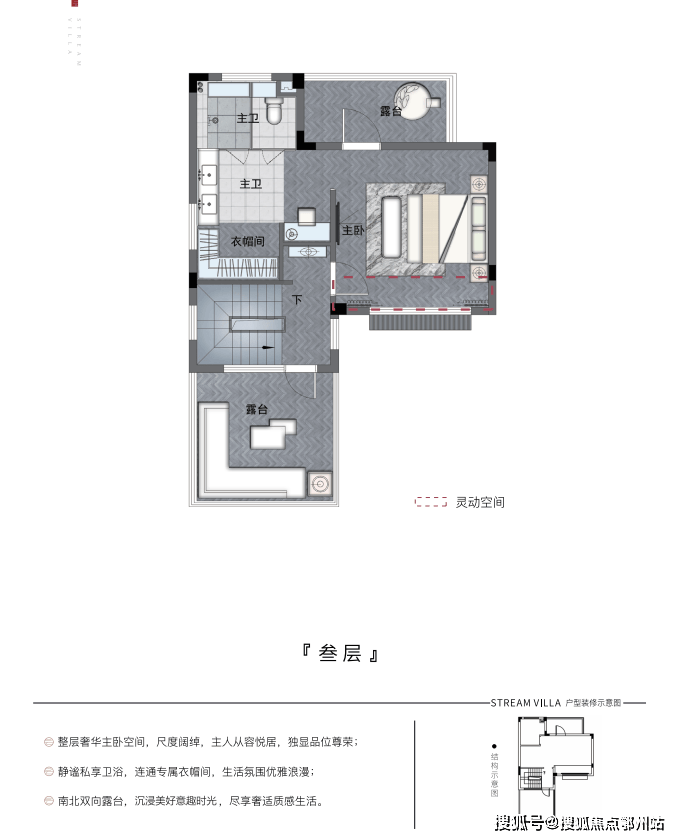 三层整层主卧套房设计,配备独立衣帽间和超大卫浴 ,私密又尊贵。 南北双露台,俨然就是空中大花园 ,养花饲草,运动健身,烧烤聚会,观星冥想,生活的小确幸都可在此完成。