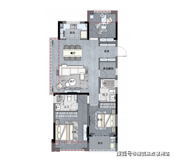 该户型 奢适四房设计 ,拥南向阳光双卧、北向次卧和书房, 一家三代同室而居,也能从容生活,尽享天伦之乐