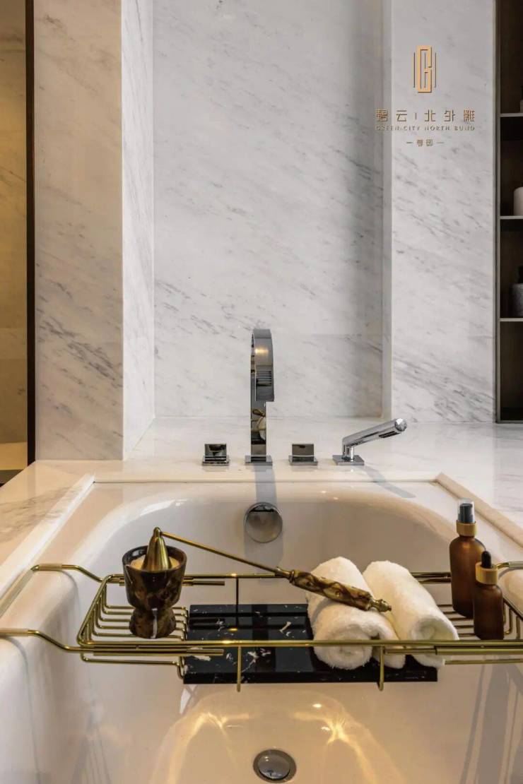 厨卫方面,西厨定制高柜,容纳嘉格纳蒸烤一体机、 嘉格纳双开门冰箱 、洗手台以及各类收纳空间;中厨自带嘉格纳灶具、油烟机和洗碗机。主卫配置 劳芬台盆 、浴缸和独立卫浴洁具空间、独立淋浴空间配备当代的花洒,顶部有松下暖风机,还配置了电热毛巾架。