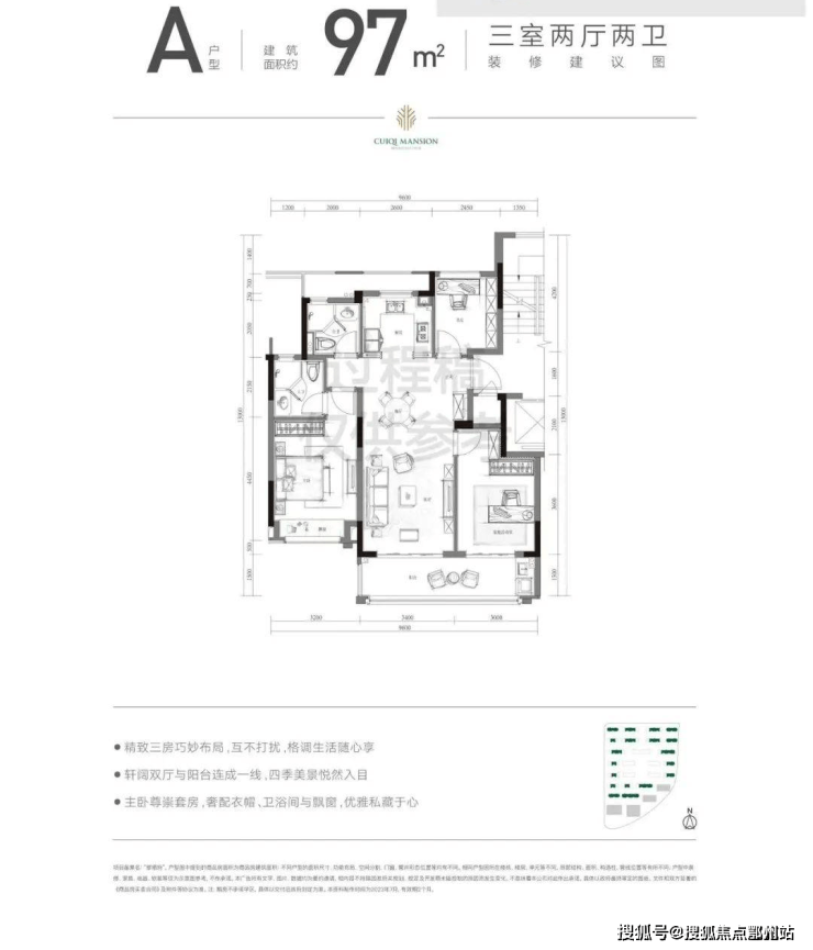 建面约97方户型格局方正,三开间朝南,南北通透。