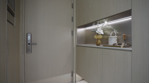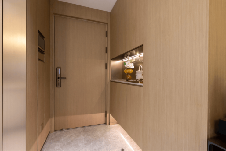项目入户门采用高端品牌金凯德的钢木复合门,搭配金属不锈钢包边, 建面约106㎡门面面宽为1米,宽于一般入户门的90cm门框,并配备博世4合1智能密码锁,高端大气的同时方便大家具进出。