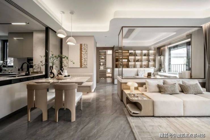 招商时代乐章艺术化的再造传统餐厨空间, 可开可合的岛台设计 ,结合艺术玻璃移门,在提升空间灵动性的同时,也激发出餐厨空间生活的多样性。