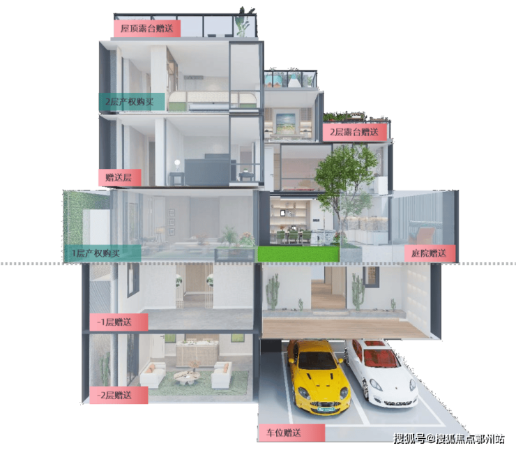 超高得房率, 最高290%赠送率户内电梯厅。一楼入户花园庭院、三楼露台花园、顶层屋顶花园,地下室约6米采光井,-1F/-2F可打造茶室、花艺室、健身房、家庭影院、机车室等。