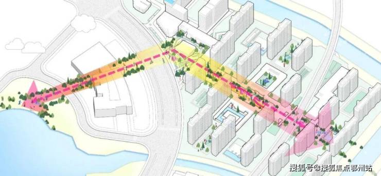 开放共享轴链接各个节点:生态运动休闲带,生态林荫大道,街区绿地; 形成连续的绿色公共、半公共空间。并在绿地中注入国际文化特点的商业配套,形成尺度宜人的街道和建筑尺度。