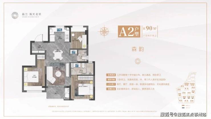 1、建面约90㎡做到了三房两卫,构筑老、中、青三代人美好生活蓝图。格局上实现了真正的全明空间与南北通透,客厅、餐厅、厨房一体,联通多功能阳台,采光通风俱佳。