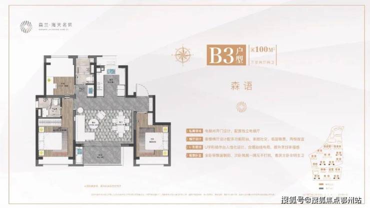 1、建面约100㎡三房两厅两卫,市场主流户型。客餐横厅设计配多功能阳台,优势在于更大采光面和更好通风效果,把过道纳入到客厅和餐厅的空间中来,使整体空间得到更好的利用。