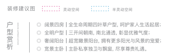 四叶草格局基本一致,但更为紧凑些,给予不同空间需求和置业预算的家庭多个选择,但同样能全面呵护家人的生活起居。