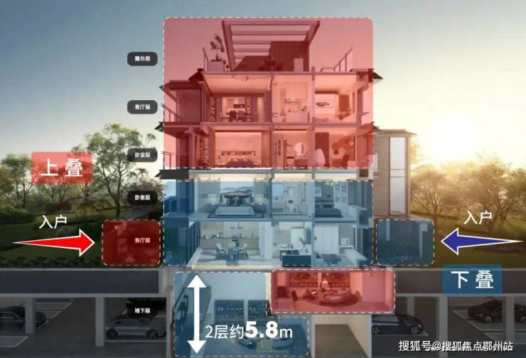 仔细看,项目的叠墅户型被分了6层空间,却并非是市场主流的上中下配置,而是单纯的上下叠配置,垂直空间内只有两户业主,分南北入户,私密性、静谧性都更加出色。