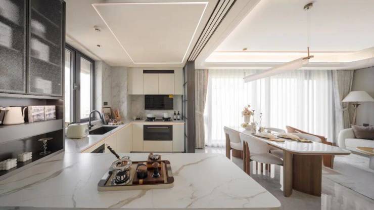 公共空间以厨房折叠门、岛台的嵌入,实现无墙化处理。餐客厅、厨房及北向书房通过大落地窗、以及客厅为中心的南北透光带打通,真正意义上实现了功能又能分而不离、约270°采光、无遮挡的空间体验。