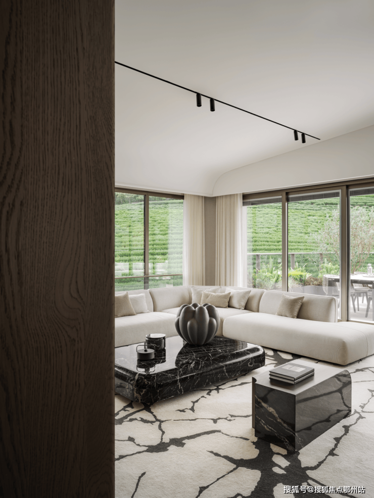 180°开阔落地窗的景观会客厅实现了聚山水田园于咫尺之间,四季葱郁的绿意作为会客饮茶的背景,恐怕是最奢侈的了。 家不单是居住的场所,还是积累人生经历与收藏的容器 ,通过空间重新构建主人的精神世界,以收藏为叙事,更能满足一家人对于生活的想象和憧憬。