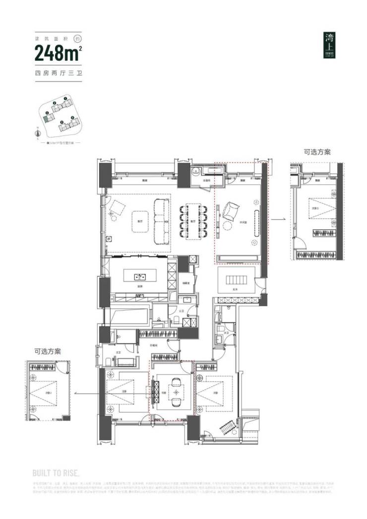 约138-198㎡大三房和定制化248㎡大四房,大师设计户型+国际品牌精装,可以根据家庭结构的变化,自行改造室内空间布局。