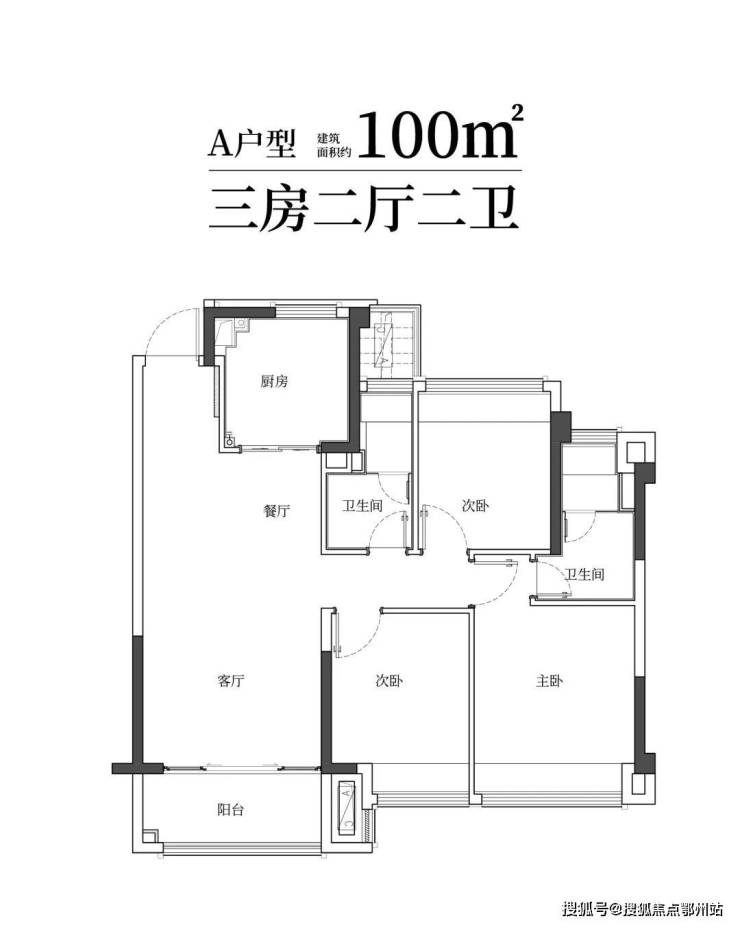 建筑面积约100㎡雅致三房两卫,满足二娃时代;