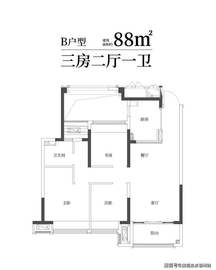 建筑面积约88㎡精雅三房一卫,三口之家理想;